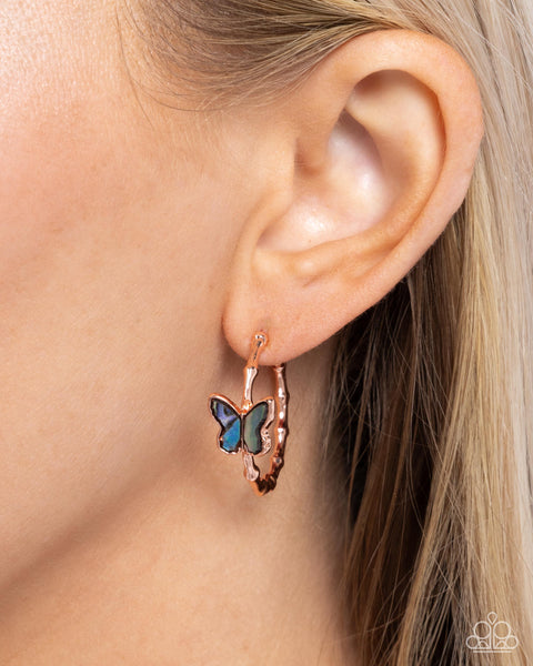 Featuring faux abalone shell wings, a dainty textured shiny copper butterfly flutters atop a glistening shiny copper warped, textured hoop, creating a whimsical sight. Earring attaches to a standard post fitting. Hoop measures approximately 1" in diameter. Due to its prismatic palette, color may vary.