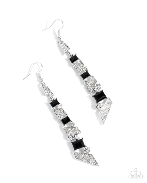 Alternating black square-cut gems and white rhinestone filled frames are stacked along a sleek silver frame. The design tapers into an angular point at the bottom, creating a striking geometric look. Earring attaches to a standard fishhook fitting.