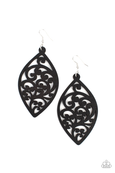 Painted in a shiny black finish, a floral motif permeates an airy oval wooden frame creating a tropical-inspired lure. Earring attaches to a standard fishhook fitting.