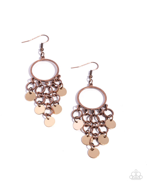 Tapered rows of gold discs and dainty copper rings cascade from the bottom of an airy copper hoop, creating a chime-like fringe. Earring attaches to a standard fishhook fitting.