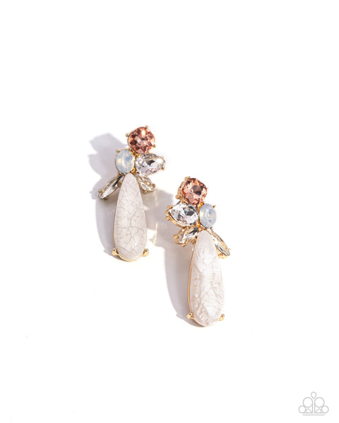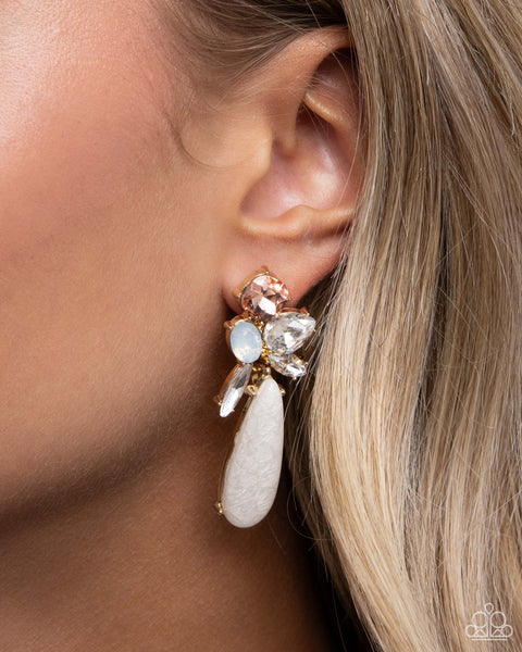Featuring various cuts, a glitzy collection of white, peach, and opal rhinestones delicately cluster into a sparkly fitting. Featuring a glittery white lacquer backdrop, an acrylic teardrop swings from the bottom of the effervescent frame for an ethereal finish. Earring attaches to a standard post fitting.