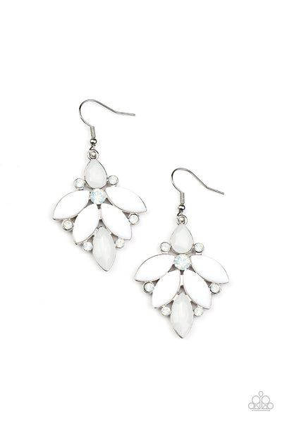 Infused with opal white rhinestones, glassy and acrylic white beads fan out into an elegantly ethereal frame. Earring attaches to a standard fishhook fitting.