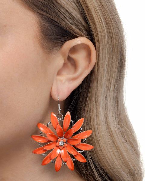 Layers of orange painted petals bloom into a bold floral design, radiating from a sparkling rhinestone center set in a silver frame. Dainty silver airy petals peek beneath the purple petals for extra flair. Earring attaches to a standard fishhook fitting.