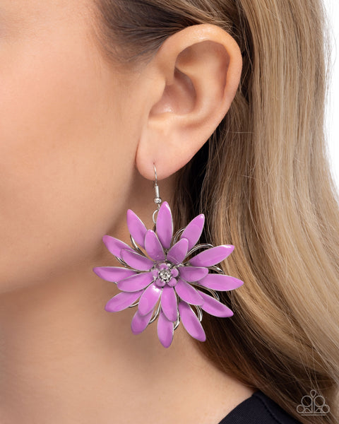 Layers of purple painted petals bloom into a bold floral design, radiating from a sparkling rhinestone center set in a silver frame. Dainty silver airy petals peek beneath the purple petals for extra flair. Earring attaches to a standard fishhook fitting.