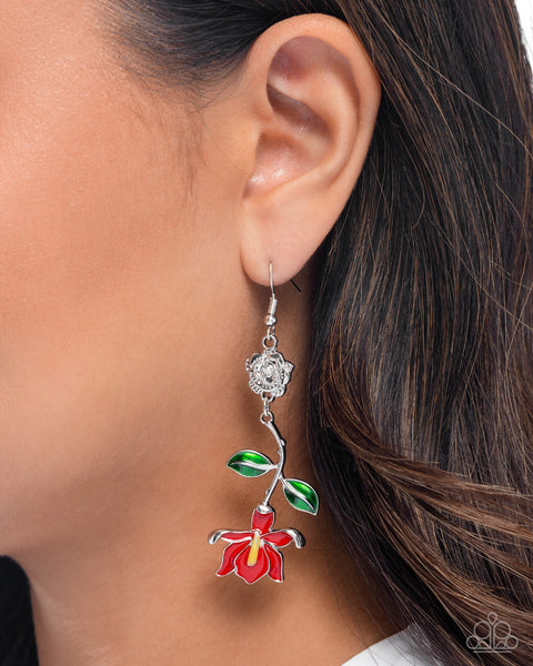 Featuring vibrant red and yellow-painted floral accents, silver framed flowers dangle below a silver stem adorned with glossy green-painted leaves. The intricate design hangs from a silver rose frame at the top, adding a charming touch to the dangling structure. Earring attaches to a standard fishhook fitting.