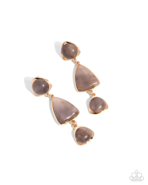Featuring elongated teardrop and round cuts, a collection of dramatically swirled chocolate acrylics delicately encased in gold triangular frames link below the ear for a sophisticatedly stylish statement. Earring attaches to a standard post fitting. Due to its prismatic palette, color may vary.