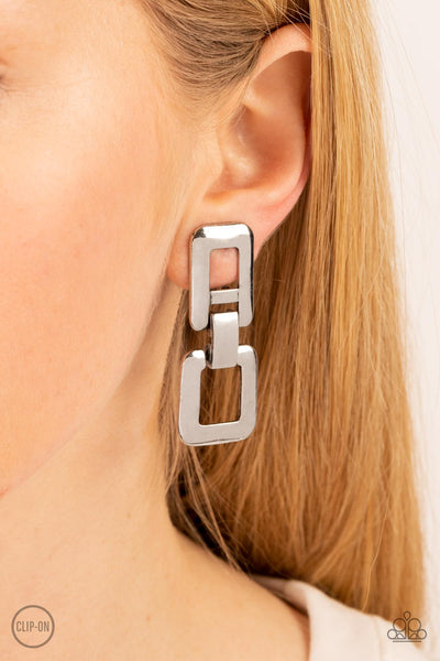 Airy square and rectangular silver frames link into an abstract lure, creating a trendy look. Earring attaches to a standard clip-on fitting.