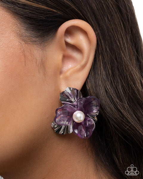 Featuring lavender swirls, a glassy Plum acrylic three-petaled flower blooms from a glossy white pearl with a hammered additional three-petaled flower framing it for a fashionably whimsical display. Earring attaches to a standard post fitting.