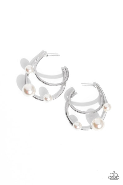 Two dainty silver bars curve into dazzling double hoops, creating an asymmetrical framework. Varying sizes of classic pearls dot the edges of the classic hoops, creating the illusion of floating pearl accents. Earring attaches to a standard post fitting. Hoop measures approximately 1 1/2" in diameter.