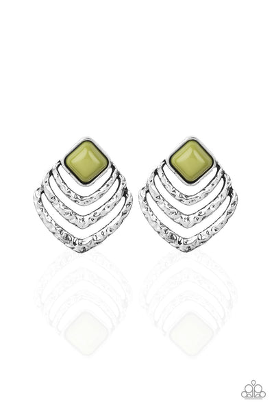 Hammered silver frames ripple from the bottom of a polished Guacamole beaded frame for an edgy look. Earring attaches to a standard post fitting.