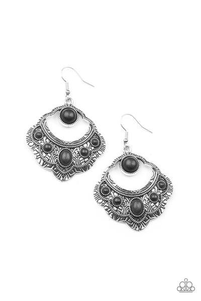 An earthy assortment of oval and round black stones adorn the front of a scalloped silver frame that is studded and engraved in tribal inspired details. Earring attaches to a standard fishhook fitting.