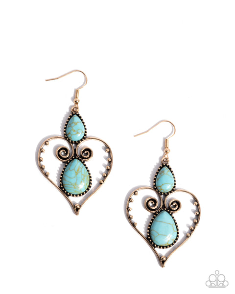 Heart-shaped gold frames, adorned with intricate swirls and dotted accents, encase teardrop-shaped marbled turquoise stones. As the stone elements in this piece are natural, some color variation is normal. Earring attaches to a standard fishhook fitting.