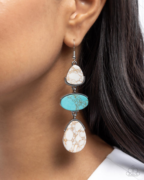 Chiseled teardrop white stones featuring brown veining link with an oval turquoise stone, creating a stacked earthy display. The textured silver frames add a rustic finish to the stone trio. As the stone elements in this piece are natural, some color variation is normal.