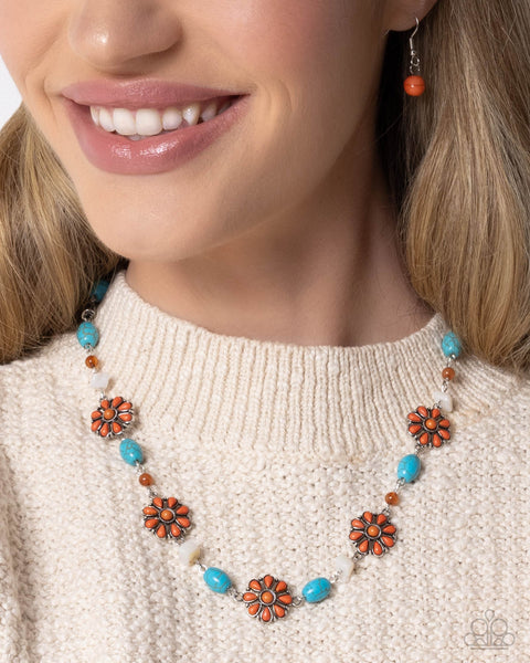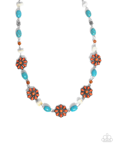 A collection of orange stone teardrop petals bloom out along the neckline for a whimsical floral display. Additional turquoise stone beads, chiseled white acrylics, textured silver discs, and Buckthorn Brown acrylics are also infused along the neckline for additional earthy detail and texture. Features an adjustable clasp closure. As the stone elements in this piece are natural, some color variation is normal.