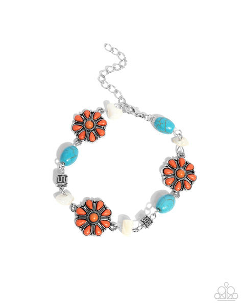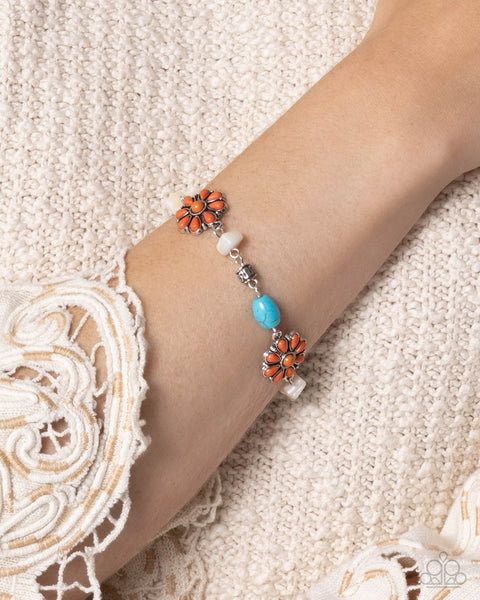 A collection of orange stone teardrop petals bloom out along the wrist for a whimsical floral display. Additional turquoise stone beads, chiseled white acrylics, textured silver discs, and Buckthorn Brown acrylics are also infused along the wrist for additional earthy detail and texture. Features an adjustable clasp closure. As the stone elements in this piece are natural, some color variation is normal.