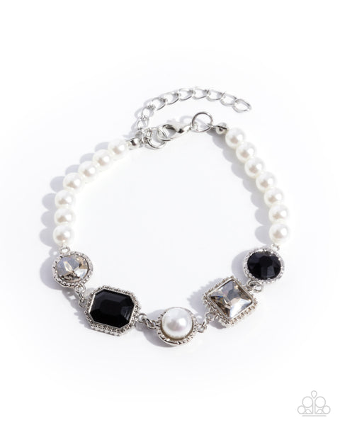 Dazzling black and smoky rhinestones, in round, square, and emerald-cuts, fall along the wrist in an alternating pattern beside a glossy white pearl. Each glittery element is bordered by silver studs or hammered texture, giving way from a glossy strand of white pearls, further amplifying and maximizing its impact. Features an adjustable clasp closure.