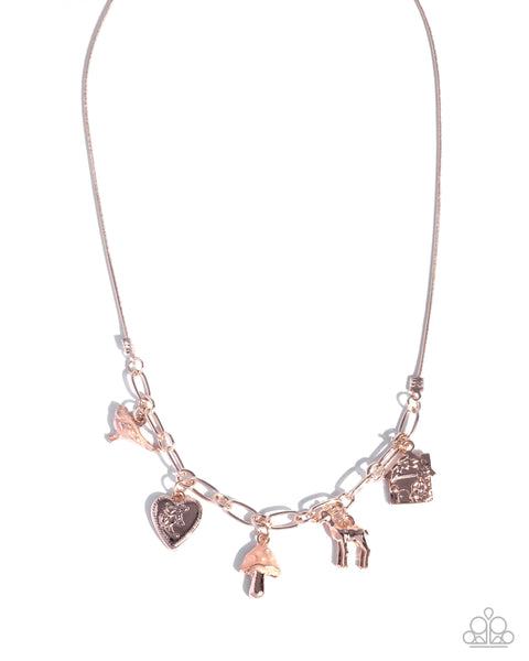 Connecting to a rose gold snake chain, a strand of rose gold paperclip chain coalesces along the center of the neckline. Swaying along the paperclip chain links, a collection of rose gold whimsical charms including a bird, a cottage, a spotted mushroom, a deer, and a heart pendant stamped with a whimsical motif cascades for a fairytale-inspired finish. Features an adjustable clasp closure.