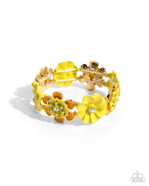 Infused along elastic stretchy bands, a collection of Saffron-painted gold flowers with a three-dimensional layered Lemon Drop flower atop alternates with solitaire textured Lemon Drop flowers along the wrist for a whimsical look. White rhinestones stack and stream out from a white gem center atop the layered flowers while the Lemon Drop flowers feature white gem centers for a shimmery finish.