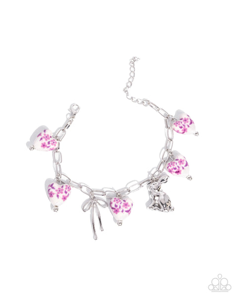 Modeled after porcelain, a collection of slightly pinched delicately painted white hearts with a purple floral pattern across their centers sway beside a silver rabbit and a silver bow around the wrist from a silver paperclip chain for a heartfelt, handmade statement. Features an adjustable clasp closure.