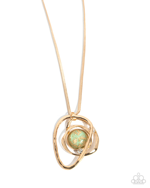 Flecked in gold foil, a light green bead centered amidst abstract concentric gold frames delicately links below the collar for a dash of refined shimmer. Solitaire white rhinestones peek out and shimmer amidst the frames for additional radiance. Features an adjustable clasp closure.