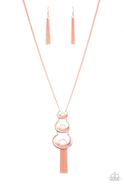 Gradually increasing in size, shiny copper moon frames curl around dewy peach beaded centers at the bottom of a classic shiny copper chain. Strands of matching shiny copper chains stream out from the bottom of the stacked pendant, creating a whimsical fringe. Features an adjustable clasp closure.