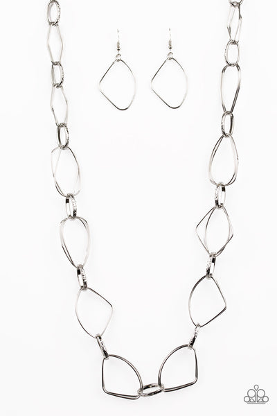 Varying in size, mismatched silver frames connect across the chest for an edgy look. Features an adjustable clasp closure.