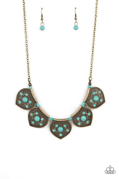 Rounded spade-shaped plates of brass are filled with studded texture, creating dizzying detail. Small turquoise stones separate each brass plate and are nestled among the raised dots, with tiny embossed leaves added to complement the natural stone elements. Features an adjustable clasp closure. As the stone elements in this piece are natural, some color variation is normal.
