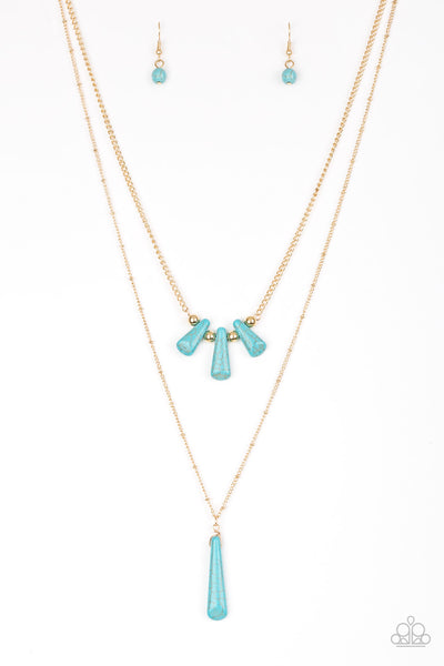 Chiseled into flared teardrop shapes, a dainty fringe of turquoise stones and golden beads gives way to a large stone pendant, creating earthy layers down the chest. Features an adjustable clasp closure.