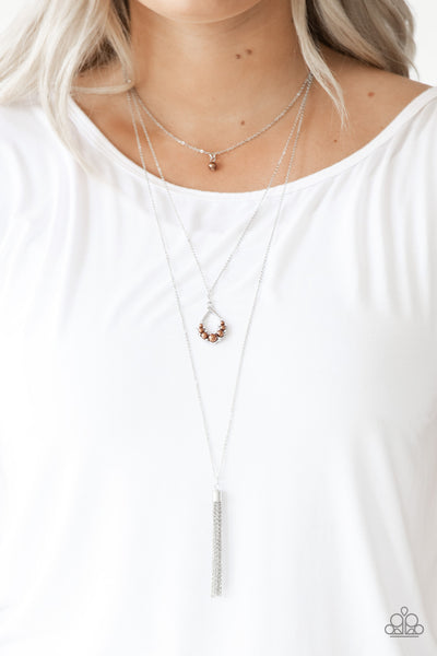 A solitaire brown pearl swings from the uppermost chain, giving way to a teardrop pendant and shimmery silver chain tassel. Dainty white rhinestones and brown pearls collect at the bottom of the centermost pendant for a glamorous finish. Features an adjustable clasp closure.