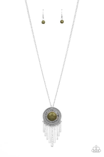 An earthy green stone is pressed into the center of a shimmery silver disc radiating with glistening tribal details. Swinging from the bottom of a lengthened silver chain, the bold pendant gives way to a fringe of delicately hammered silver rods for a wanderlust finish. Features an adjustable clasp closure.