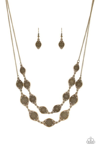 Featuring ornate brass centers, marquise shaped frames link into two rows below the collar for a rustic look. Features an adjustable clasp closure.