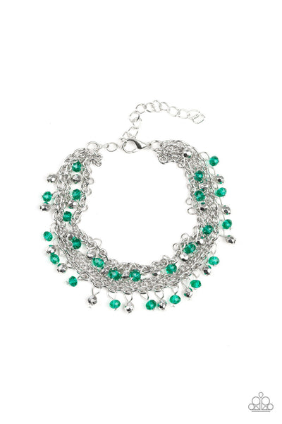 Dainty silver and green crystal-like beads cascade from two shimmery silver chains. Infused with plain silver chains, the colorful strands layer around the wrist for a flirtatious look. Features an adjustable clasp closure.