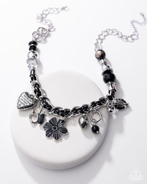Giving way from a chunky silver chain, a collection of eclectic beads including textured silver rings, hammered silver links, defaced black beads in varying sizes, silver cap fittings, a crystal-like white bead, and a gold-brushed black bead cascade below the neckline. Black and ivory cording is braided through a chunky silver curb chain from the silver cap fittings, adding a touch of visual interest below the neckline. A variety of feminine and garden-inspired charms cascade from the braided cord including stacked links, solitaire black beads, textured rings, hammered and sleek hearts, a black-painted flower, a textured flower, and a heart inscribed with the phrase "With All My Heart" on one side and a short bible verse on the other that reads, "Love the Lord thy God with all your heart. Luke 10:27." Features an adjustable clasp closure.