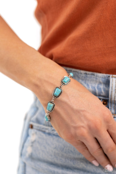 Encased in silver fittings, trapezoidal turquoise stones delicately fan out around the wrist for a dramatic pop of color. Features an adjustable clasp closure. As the stone elements in this piece are natural, some color variation is normal.