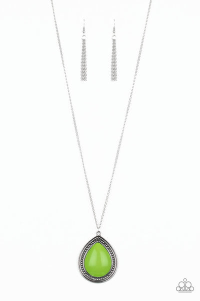 An oversized green bead is pressed into the center of a studded teardrop frame, creating a vibrant pop of color at the bottom of a lengthened silver chain. Features an adjustable clasp closure.