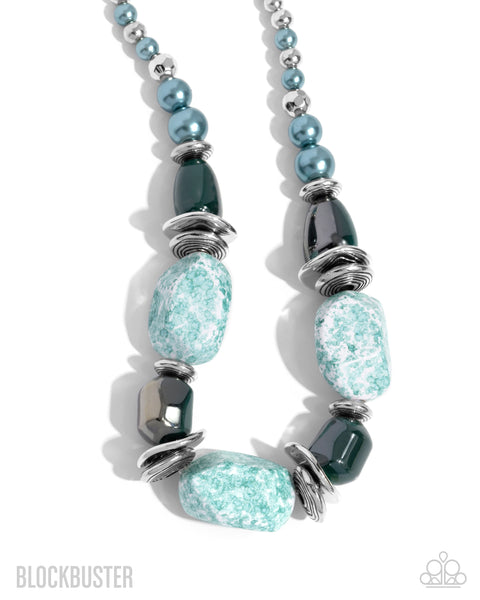 Infused along an invisible string, a collection of abstract chunky white beads with speckles of blue alternate with solitaire abstract blue beads with a gorgeous glazed finish, round blue pearls, silver beads, doubled layers of thick textured silver rings, and defaced silver beads, creating an eye-catching, engaging display along the neckline. Features an adjustable clasp closure.