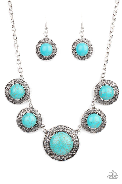 Turquoise stones, pressed into round silver frames made of concentric rows of open circles, create a dramatically rustic statement as they link across the collar. Features an adjustable clasp closure.