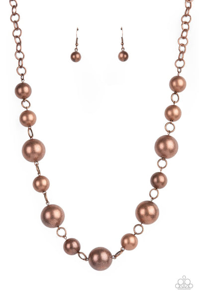 An oversized collection of intense copper beads boldly link below the collar, creating a dramatic industrial display. Features an adjustable clasp closure.