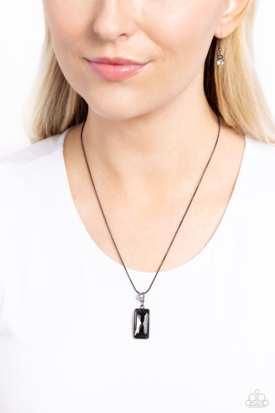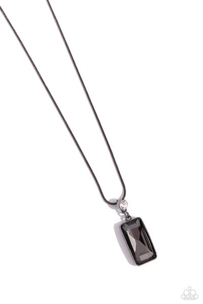Encased in a sleek gunmetal frame, an emerald cut smoky gem swings from the bottom of a solitaire white rhinestone along a rounded gunmetal snake chain for an out-of-this-world finish. Features an adjustable clasp closure.