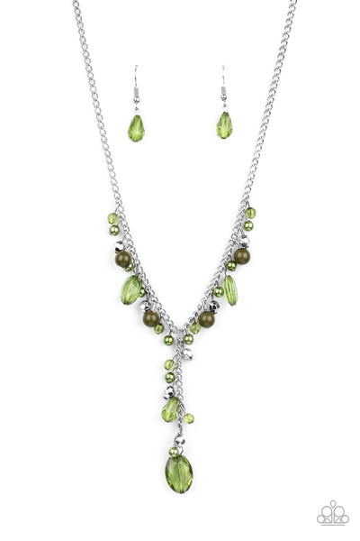 Mismatched polished green beads, crystal-like beads, and faceted silver beads dance along a shimmery silver chain. Matching beading trickles along a single silver chain, creating a romantic extended pendant below the collar. Features an adjustable clasp closure.