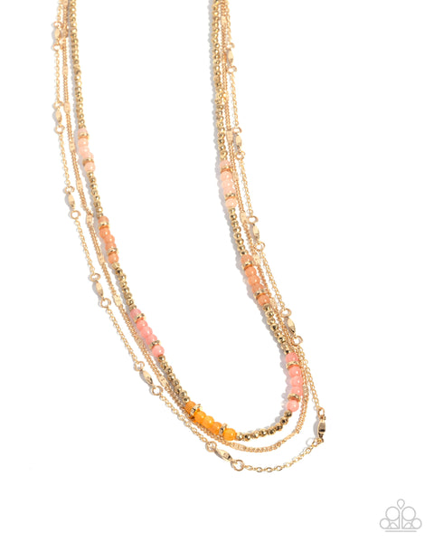 Dotted with Tomato Cream, Light Peach, coral, and orange beads, defaced gold beads, gold discs, and various glistening gold accents, a collision of mismatched gold chains layer down the chest for a rustic radical flair. Features an adjustable clasp closure.