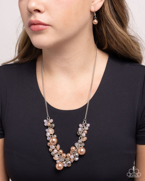 Connecting to a dainty silver chain, a clustered collection of Brush pearls, faceted silver beads, hammered silver beads, milky Desert Rose acrylics, and opalescent Desert Rose beads coalesce below the neckline for a dynamic debonair display. Features an adjustable clasp closure.