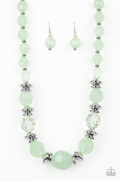 Infused with shimmery silver accents, faceted green beads gradually increase in size as they join below the collar for a refreshing springtime look. Features an adjustable clasp closure.