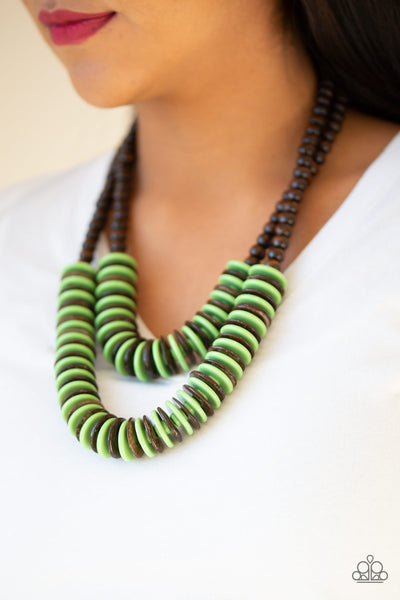 Brown wooden beads give way to rows of green and brown wooden discs, creating colorful layers for a summery look. Features a button-loop closure.