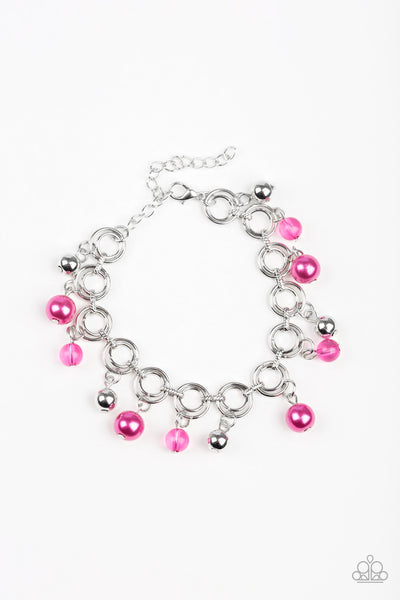Featuring pearly and glassy finishes, an array of silver and pink beads swing from a double-linked silver chain, creating a fancy fringe around the wrist. Features an adjustable clasp closure.