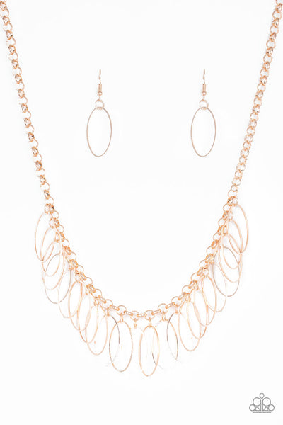 Oval rose gold frames dangle from a bold rose gold chain, creating a dizzying fringe below the collar. Features an adjustable clasp closure.