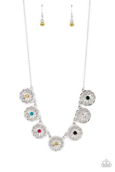 Dotted with colorful rhinestone centers, decorative silver flowers bloom from circular silver frames as they link below the collar for a flirtatious floral fashion. Features an adjustable clasp closure.