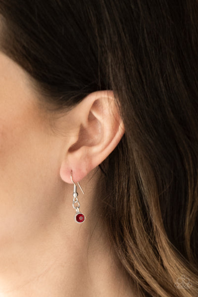 Glistening silver hoops and a red rhinestone encrusted ring swing from the bottom of a lengthened silver chain, creating a glamorous pendant. Features an adjustable clasp closure.