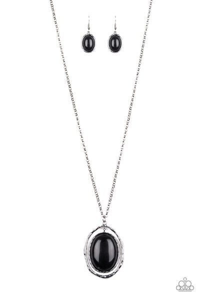 A glassy black bead is pressed into the center of a stacked gunmetal frame radiating with shimmery hammered textures. The oversized pendant swings from the bottom of a lengthened gunmetal chain, adding a whimsical pop of color to any outfit. Features an adjustable clasp closure.
