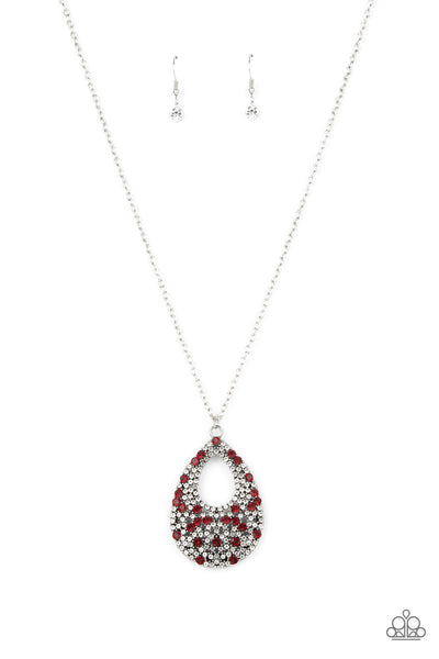 A sparkly explosion of glassy white and fiery red rhinestones haphazardly coalesce into a teardrop frame at the bottom of a lengthened silver chain, creating a twinkly pendant. Features an adjustable clasp closure.
